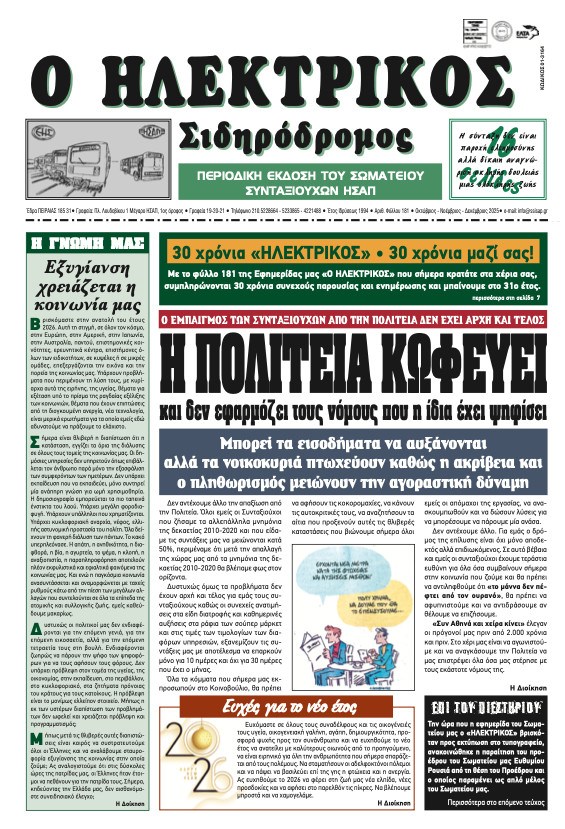 Προετοιμαζόμαστε για το νέο τεύχος του ΗΛΕΚΤΡΙΚΟΥ Σιδηροδρόμου τ. 181. Την Τρίτη 30 Δεκεμβρίου 2025 ο δημοσιογράφος που επιμελείται την εφημερίδα μας, κατέβηκε στο Σωματείο και παρέλαβε την ύλη. Ευχαριστούμε, που φροντίσατε, να δώσετε έγκαιρα στον πρόεδρο του Σωματείου συν. Ρουσιά Ευθύμιο ότι θέλετε να δημοσιεύσετε. Θέλουμε το έντυπο μας με ιστορία μεγαλύτερη των 30 χρόνων να μη χάσει τη ζωντάνια της επικοινωνίας μαζί σας…