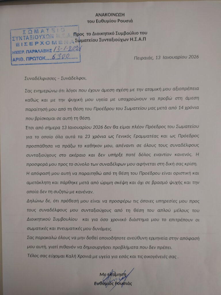 Σας ενημερώνουμε ότι μετά την απόφαση 2942/2024 του Τριμελούς Εφετείου Αθηνών που επιδικάζει το ποσό των 15.000 ευρώ (που με τους τόκους γίνεται 32.691,00 ευρώ) στην πρώην Προϊσταμένη του Ταμείου Συντάξεων Προσωπικού ΗΣΑΠ κα. Ελένη Λιάπη και με την αδυναμία του Σωματείου να αποπληρώσει το ποσό αυτό, υπάρχει άμεσος κίνδυνος διάλυσης του Σωματείου μας και ειδικά μετά το από 3 Απριλίου κατασχετήριο που μας έχει αποσταλεί και με το οποίο κατασχετήριο στις 28 Απριλίου έγινε κατάσχεση σε ό,τι χρήματα υπήρχαν στο βιβλιάριο τραπεζών του Σωματείου, καθώς επίσης και στα βιβλιάρια του Προέδρου Ευθυμίου Ρουσιά και του Γεν. Γραμματέα Νικόλαου Μητροκώτσα.