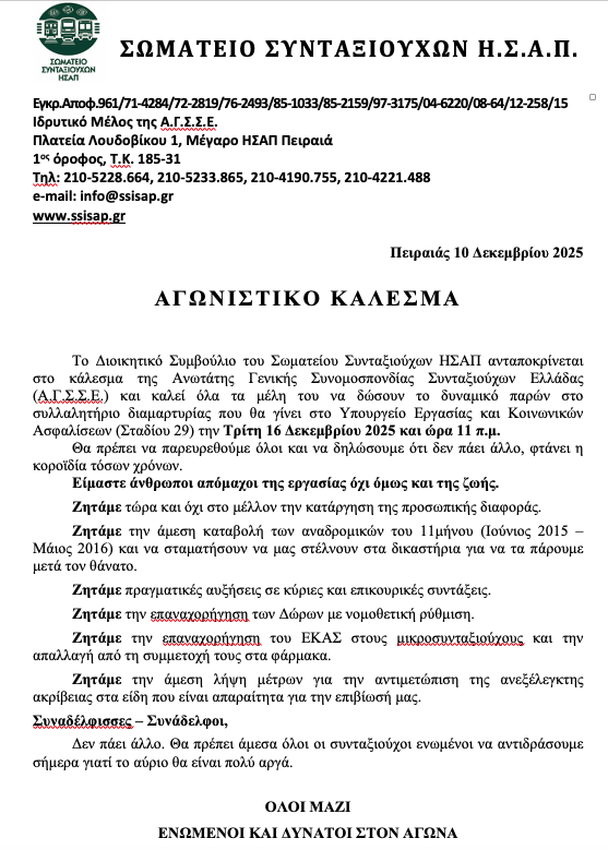 Το Διοικητικό Συμβούλιο του Σωματείου Συνταξιούχων ΗΣΑΠ ανταποκρίνεται στο κάλεσμα της Ανωτάτης Γενικής Συνομοσπονδίας Συνταξιούχων Ελλάδας (Α.Γ.Σ.Σ.Ε.) και καλεί όλα τα μέλη του να δώσουν το δυναμικό παρών στο συλλαλητήριο διαμαρτυρίας που θα γίνει στο Υπουργείο Εργασίας και Κοινωνικών Ασφαλίσεων (Σταδίου 29) την Τρίτη 16 Δεκεμβρίου 2025 και ώρα 11 π.μ.
