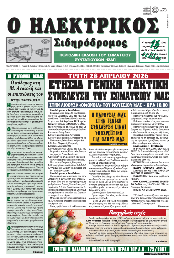 Ολοκληρώσαμε σήμερα (01/04/2026) την έκδοση της νέας εφημερίδα μας,  «ΗΛΕΚΤΡΙΚΟΣ Σιδηρόδρομος» τ. 182 και την προωθήσαμε στο πιεστήριο για εκτύπωση. Καλώς εχόντων των πραγμάτων την ερχόμενη Τρίτη θα είναι στο Σωματείο και θα έχει προωθηθεί μέσω των ΕΛΤΑ στα σπίτια όλων των συναδέλφων. Ελπίζουμε στα προβλήματα που αντιμετωπίζει στη διακίνηση της αλληλογραφίας να μην προστεθούν στις αργίες των ημερών και όλα να πάνε καλά. Ευχαριστούμε όλους για την καλή συνεργασία…